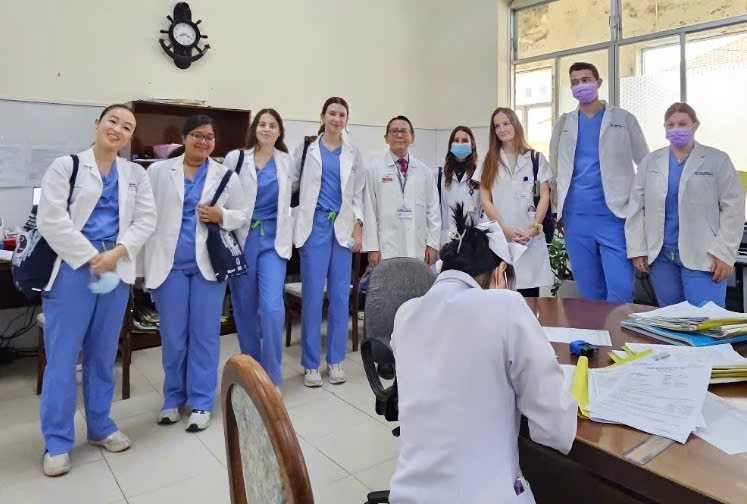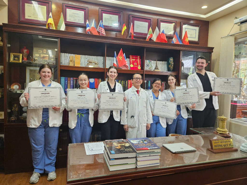 GS.TSKH.BS Dương Quý Sỹ giảng dạy thực hành lâm sàng cho sinh viên y khoa Đại học Penn State – Mỹ & Paris Cité – Pháp tại BVĐK Lâm Đồng hàng năm (Lâm Đồng, tháng 7/2025).